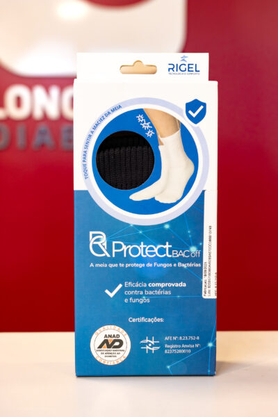 A eficiência das meias RG Protect Bac Off é comprovada por laboratórios independentes, seguindo protocolos têxteis internacionais como a norma AATCC100 e uma adaptação da AATCC100 para fungos.